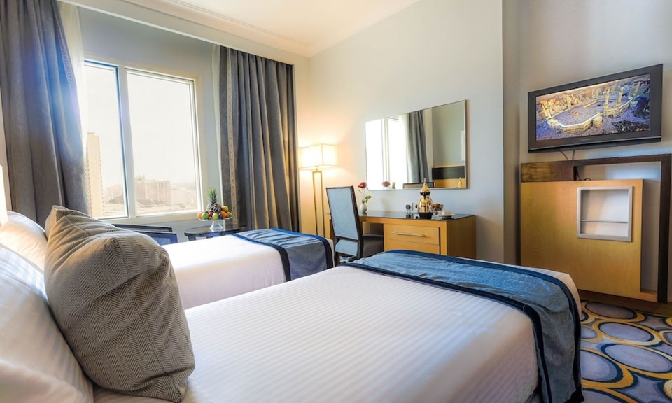 The hotel is located in the Ajyad district, 250 m away from the holy mosque. The hotel is approximately 90 km from Jeddah International Airport. This city and business hotel offers a total of 304 rooms. The hotel meeting rooms, situated on the 3rd mezzanine level, cater to the needs of business people who like to combine business with religion. They are equipped with latest audio visual equipment and wireless Internet access. Other facilities at this air-conditioned establishment include a lobby with 24-hour reception, lift access to the rooms, a restaurant and car park. Room service and a laundry service (both for an additional fee) are also available. The hotel rooms are medium in size, well furnished and fitted with an LCD TV with satellite/cable channels, a small sitting area, a safe, a mini fridge and complimentary tea and coffee making facilities. Each room has a shower, double bed and Internet access. Individually regulated air conditioning and heating ensures maximum comfort throughout the year. The Al Rukun lobby lounge is located in the lobby level of the hotel and serves delicious and fresh pastries, as well as snacks, throughout the day.