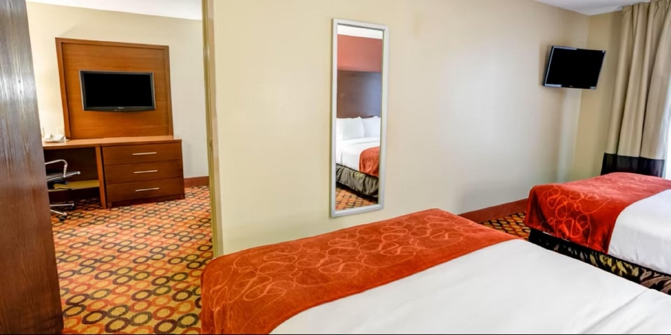 Location You’ll be sleeping tight! Hotel «Comfort Suites Airport» is located in Charlotte. This hotel is located in 7 km from the city center. You can take a walk and explore the neighbourhood area of the hotel. Places nearby: Carolinas Aviation Museum.At the hotel Spend an evening in a nice atmosphere of the bar. Free Wi-Fi on the territory will help you to stay on-line. If you travel by car, there’s a parking zone. The beauty and wellness services: a doctor. Sports fans are going to love a fitness center and a gym. Tourists who can’t live without swimming will appreciate a pool and an indoor pool. For business meetings, there is a business center. If you want to make your journey even more comfortable, you can order a transfer. Accessible for guests with disabilities: the elevator helps them to go to the highest floors. At the guests’ disposal, there’s also a laundry, dry cleaning, an ATM, ironing, press and a safe-deposit box. The staff of the hotel will be happy to talk to you in English.Room amenities In the room, for you, there is a TV. The room equipment depends on its category.